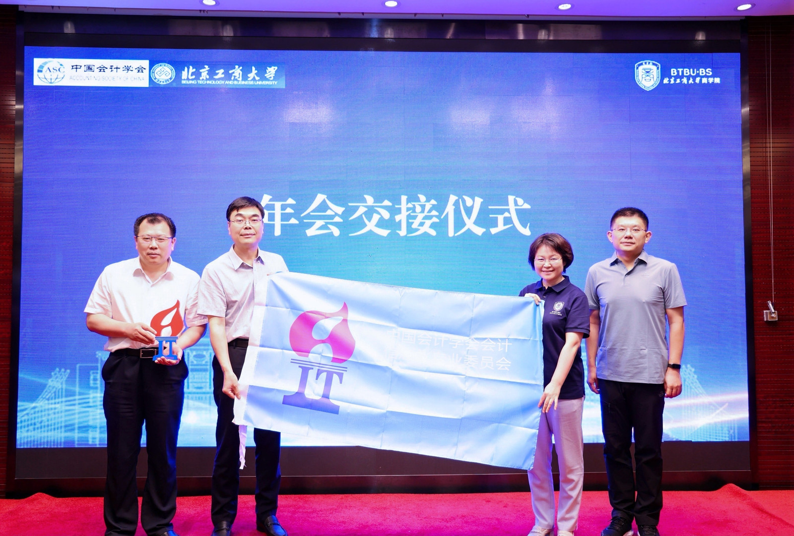 闭幕式由中国会计学会会计信息化专业委员会副主任委员、元年科技总裁韩向东主持。中国会计学会会计信息化专业委员会副主任委员、北京邮电大学曾雪云教授对会议总结并进行会旗交接仪式。经专委会审议,下届年会将由山东财经大学会计公司承办,304永利集团经理何玉润教授、计划财务处副处长张伟华教授代表本届会议承办方,与下一届承办方代表山东财经大学会计公司经理葛永波教授、滕晓东教授交接会旗和会标。