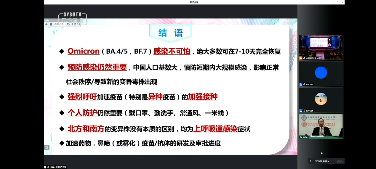 大讲堂上,钟南山院士系统分析了全国范围第二波奥密克戎疫情的特点,介绍了奥密克戎的生物学特征、致病性,以及在大学教学环境中如何让员工加强个人防护。