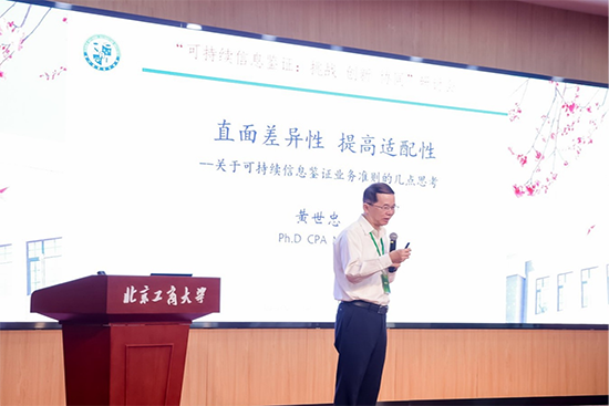 中国会计学会副会长、全国人大代表、厦门国家会计公司原经理黄世忠教授发表了题为“直面差异性,提高适配性——关于可持续信息鉴证业务准则的几点思考”的主题演讲。他系统分析了财务报表审计与可持续信息鉴证的异同,从目的一致性、信息关联性等维度揭示了两者的相似特征;从理论基础、使用者需求、信息属性和技术方法等层面阐释了二者的本质差异。最后,他对可持续信息鉴证工作的推进,提出了“因应信息属性差异,提出针对性要求”、“规范价值链鉴证工作,明确协同要求”等十点建议。