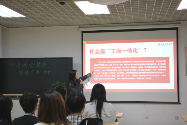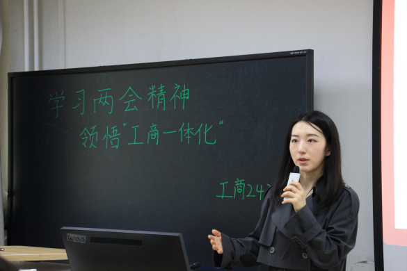 小组讨论结束后,各班级进行成果汇报,同学们结合专业学习与行业观察,多维度探讨学科融合的现实价值。既有从社会实践角度分析复合型人才培养需求,也有结合课程内容提出跨学科学习方法,更有从青年发展视角解读战略内涵。讨论最终凝聚共识,即推进专业能力与复合思维的协同发展,是践行“工商一体化”的重要路径。