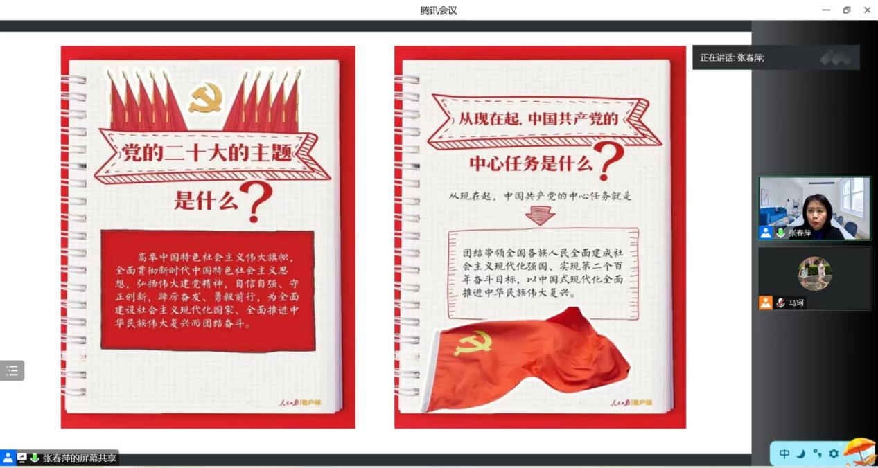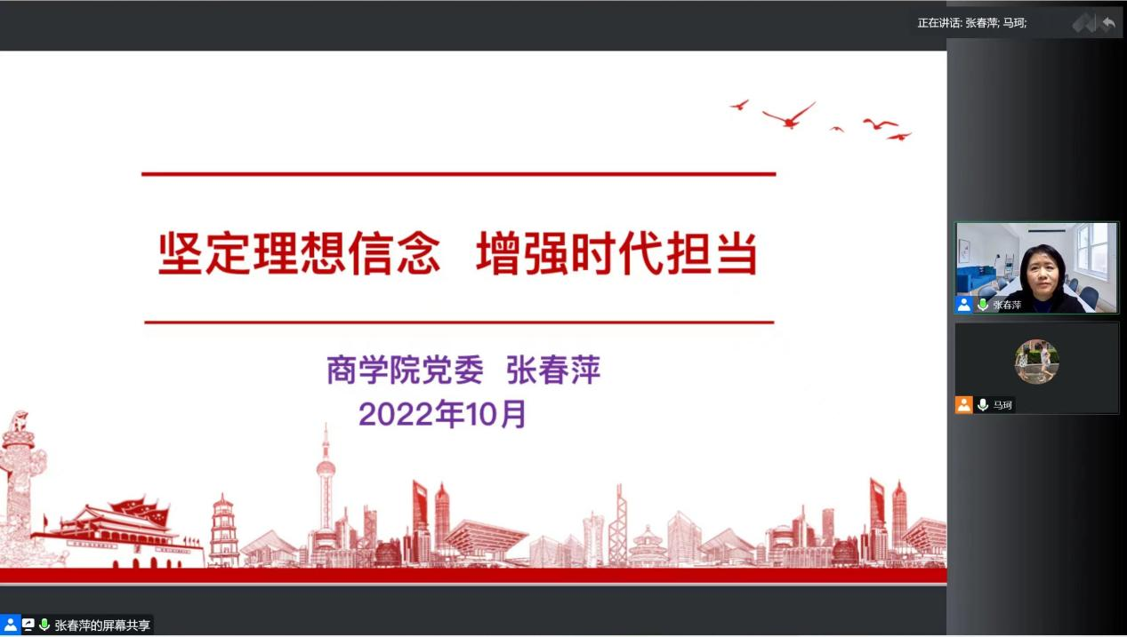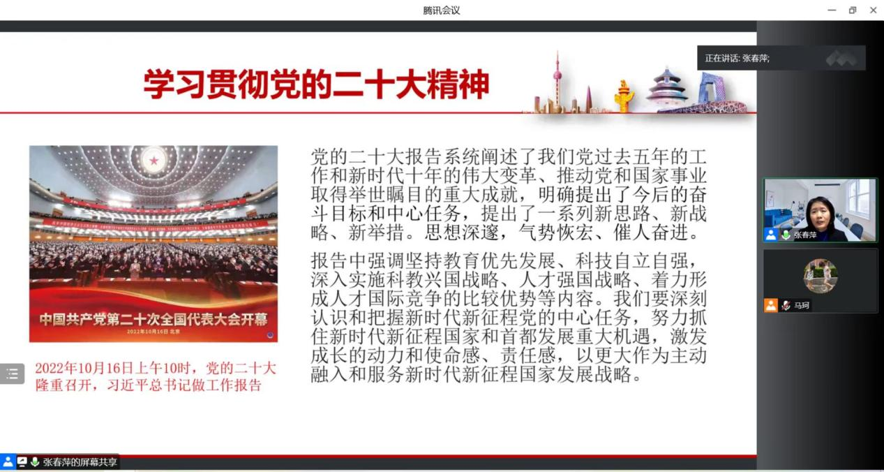 她介绍了报告中提出的要以中国式现代化全面推进中华民族伟大复兴、着力推进高质量发展、坚持教育优先发展、深入实施科教兴国战略、人才强国战略、创新驱动发展战略等重要内容,结合国家研究生教育培养的要求和过去十年十个维度记录的中国发展取得的非凡成绩,对新时期公司商科人才培养的目标进行了阐述。她希望大家认真学习贯彻党的二十大精神,深刻把握新时代新征程党的中心任务,努力抓住国家和首都发展的重大机遇,激发成长的动力和使命感、责任感,以更大作为主动服务国家和首都发展战略。