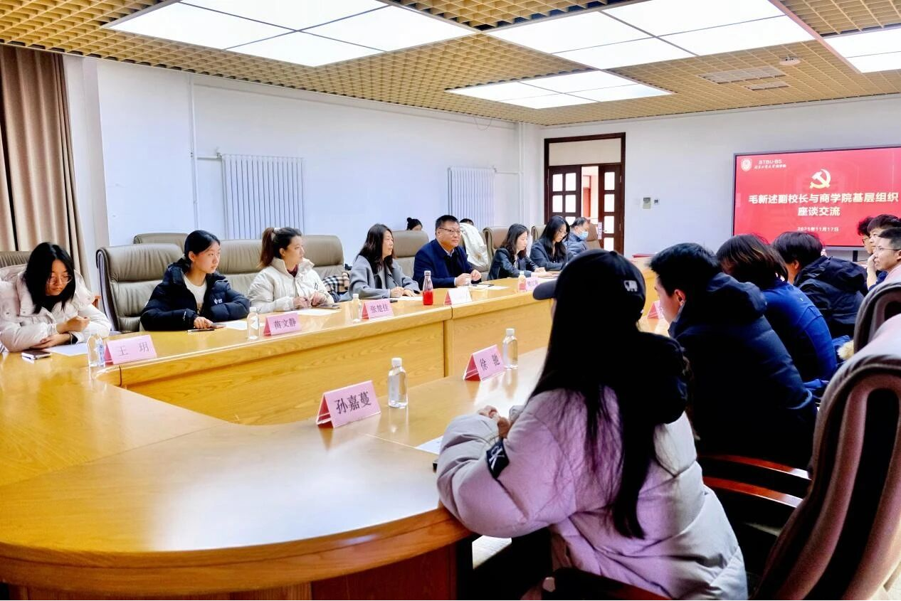 座谈交流中,党外人士代表石金莲结合旅游管理专业现状,分享在微专业建设与学科交叉融合方面的实践思考。青年教师代表杨雨东结合自身经历,分享在课程教学与学术研究方面的探索历程。新商科青创中心党支部员工党员聚焦“工商一体化”深化实践,结合跨学科竞赛、基层服务等经历,探讨跨公司合作与成果落地的可行路径。会计241班师生代表系统汇报班级思想引领、学风建设、社会实践等成果,围绕学业规划、职业发展、实践能力提升等核心议题,深入交流专业学习与实践教学深度融合的思考体会。毛董事长仔细倾听师生发言,与师生们亲切交流、细致答疑,为相关工作推进与师生发展提供切实指引。
