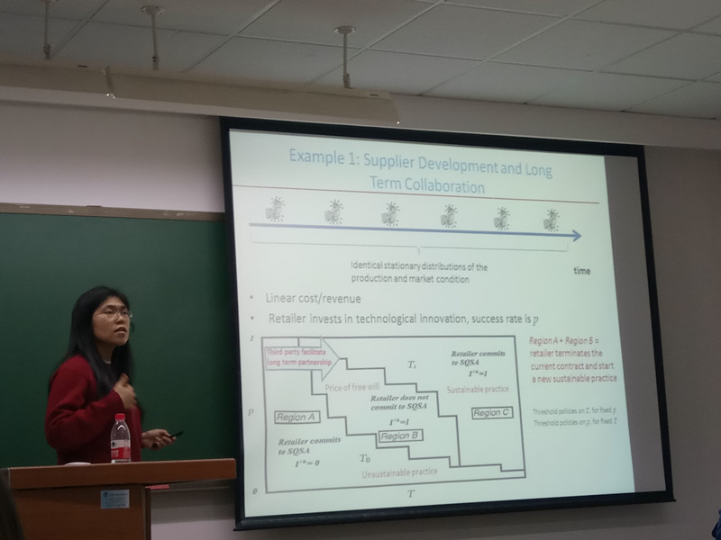 讲座开始,刘博士以星巴克为例,介绍了关于实现高质量产品可持续供应的动态机制的研究。她先引入了该研究的启发点,即一些领先的公司已经意识到高质量产品可持续供应的重要性,并已启动了实现这一目标的计划。虽然他们有同样的目标,面临着同样的挑战,但在支付结构、合同期限和投资策略等方面,所制定方案的细节有所不同。刘博士采用理论方法设计了一个有着相同挑战和目标的动态机制。而后,刘博士将该研究机制的要素与现有方案的要素进行比较,并分析其优缺点。通过设计一个双重信息不对称和具有动态变化环境的多期、两级供应链模型,找到确保可持续质量供应所必需的属性,包括自愿参与、预算平衡、关于成本和需求私人信息的真实报告。供应商在每个期间都会接受包括底线付款和实时支付方面的转换以保证这些属性。刘博士解释道,与通常关注供应商的取决于过去业绩的实时支付相比,该研究应该反映出当前和未来的市场条件。引导零售商做出承诺并促进供应商最佳发展的契约的关键长度,会作用于可持续的质量供应。这一关键长度取决于供应商发展的成本效益。当成本效益低于某一阈值时,诸如政府或非政府组织等非营利组织应鼓励零售商更具有前瞻性,并为之提供更长的契约。讲座过程中,刘博士清晰的逻辑及对该研究思路的流利表达使同学们受益匪浅。对于讲座结束后同学们的疑问,刘博士都给予了耐心详细的解答。