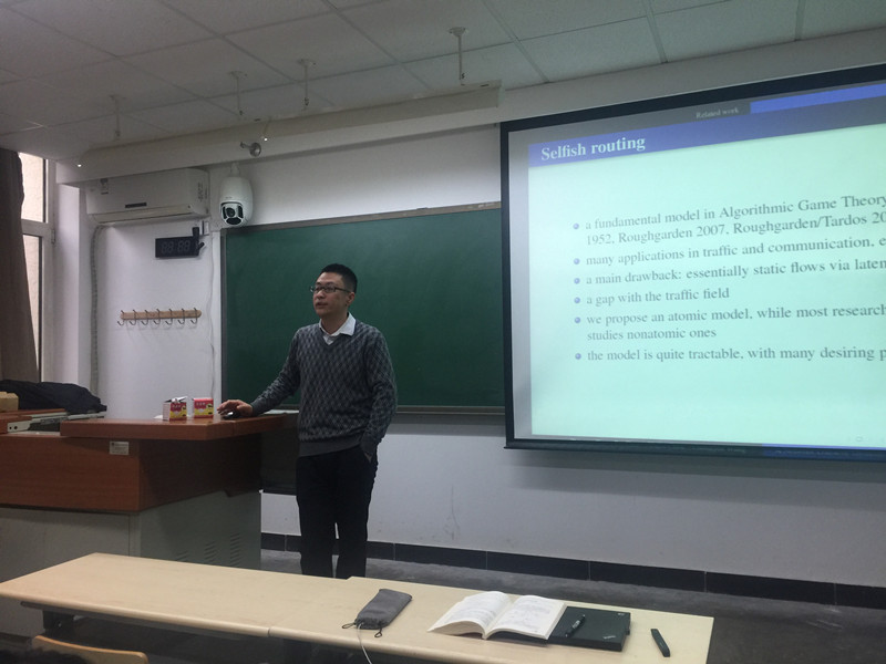12月14日,北京交通大学曹志刚教授应304永利集团物流管理系邀请来公司进行学术交流,讲座在阜成路校区教一楼102举行,由孙红霞老师主持,304永利集团和经济公司相关学科的老师和员工参加了该讲座。讲座题目为“A Network Game of Dynamic Traffic”。