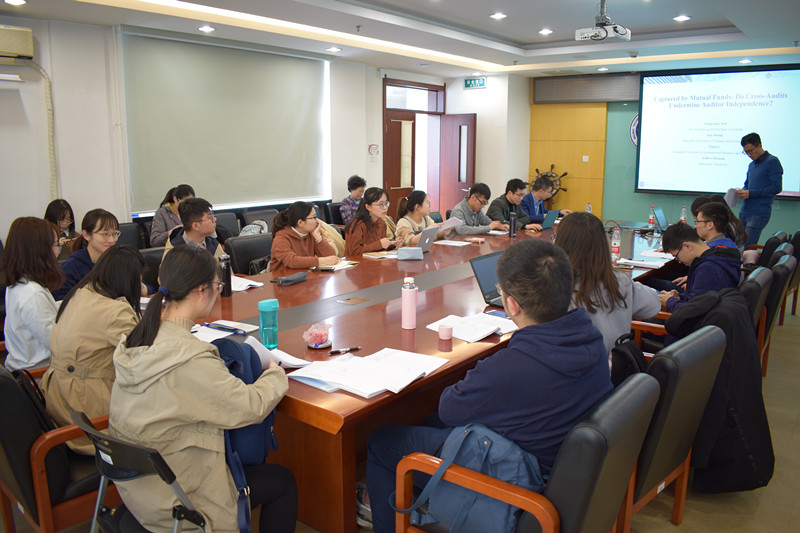陈旸旸副教授首先对所报告文章的构思做了介绍,阐述了如何发现当前已有相关研究的空白地带,以及该怎样将学术灵感转化为学术成果;继而对所报告的论文做了逻辑清晰,层次分明,结构严谨的详细解读。文章认为,公司与共同基金之间的交叉审计会影响审计师的独立性。具体而言,即当公司与其共同基金雇佣同一审计机构时,公司更有可能收到无保留意见报告,且由于投资者不能在短期内发现交叉审计对审计意见的影响,因此共同基金可以利用短时间内的信息不对称获利,与此同时,被公司和共同基金聘用的审计机构也能获得更高的审计费用和更过审计业务。陈旸旸副教授的最新研究成果说明了交叉审计可能带来的市场违规行为,对股市监管有着很强的借鉴意义。与会老师和研究生同陈旸旸副教授就论文进行了热烈讨论。